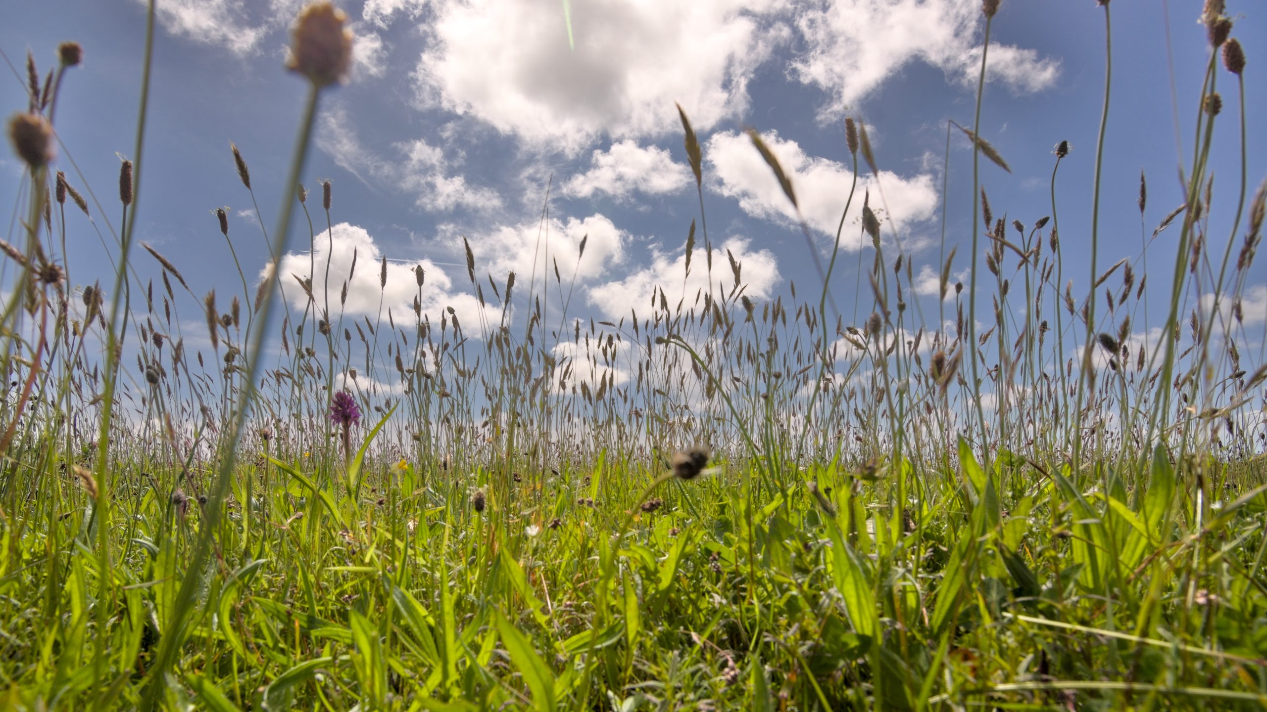 Meadow grasses reaching up to a blue sky and fluffy clouds evoking lazy summers